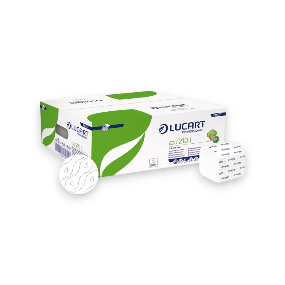 Papel higienico interplegado gofrado elaborado con fibras recicladas.