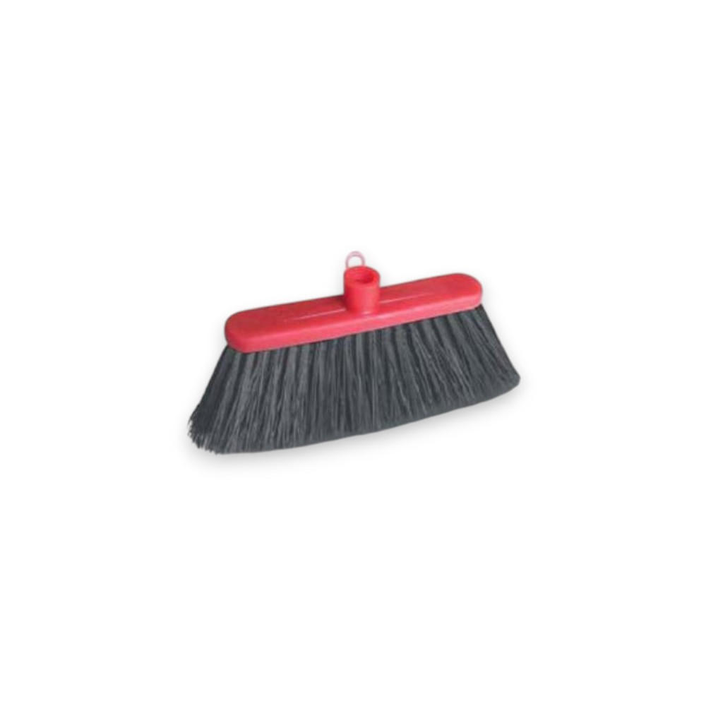 Escoba moqueta con cuerpo fabricado en plastico rojo y fibras rígidas negras.